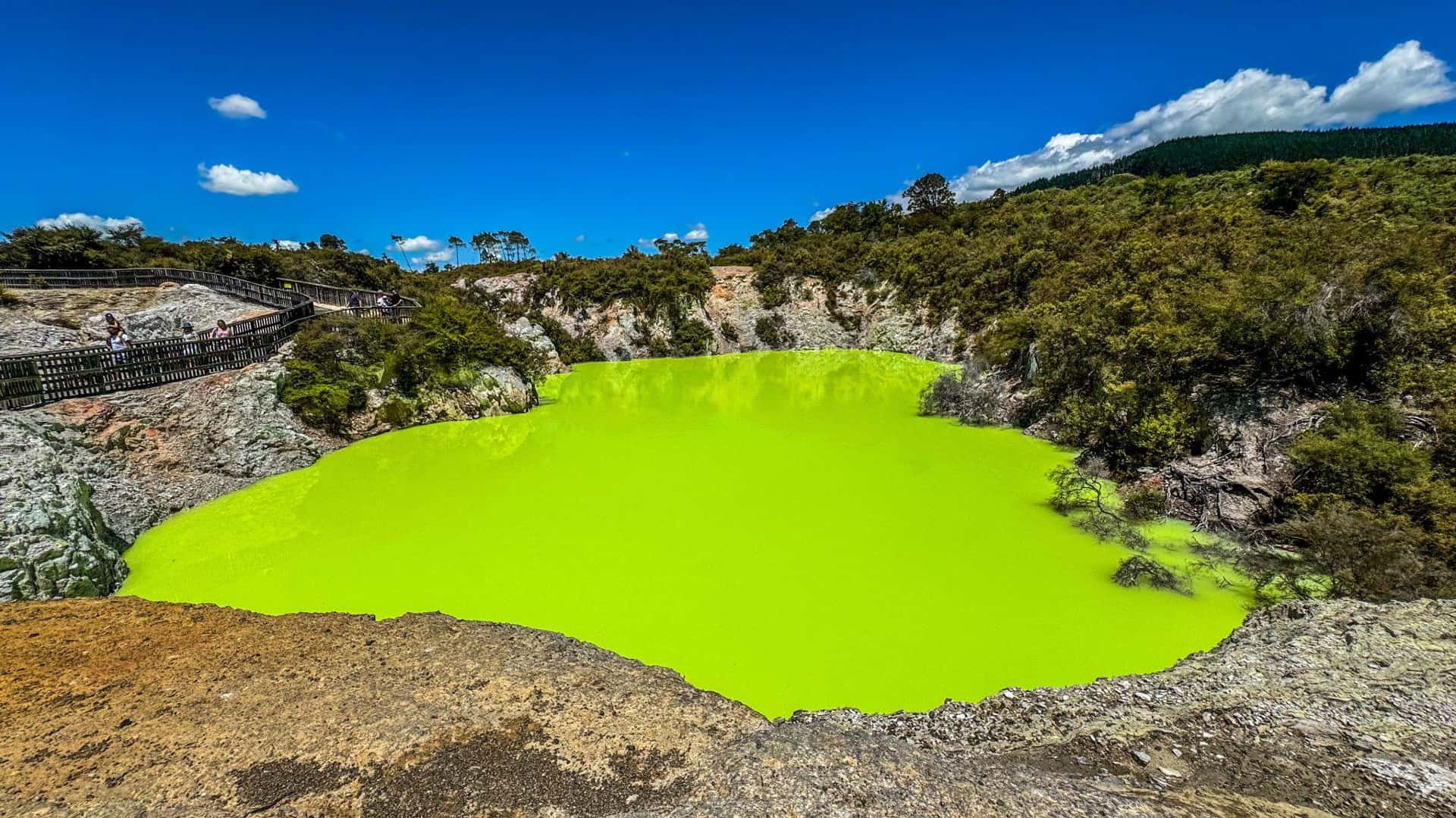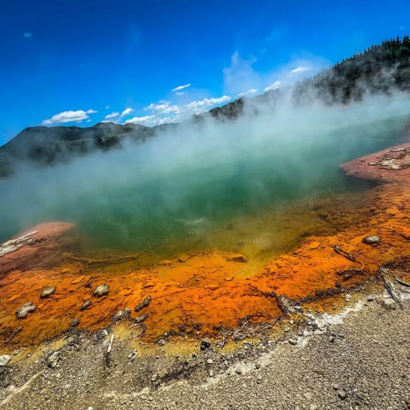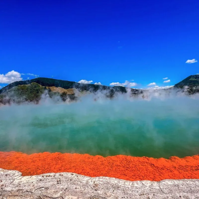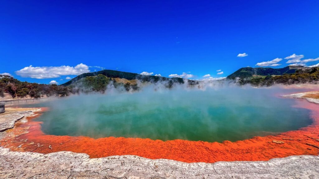 - Park z gejzerami (Rotorua): Bulgotające błota, gorące źródła. Wai-O-Tapu i Whakarewarewa