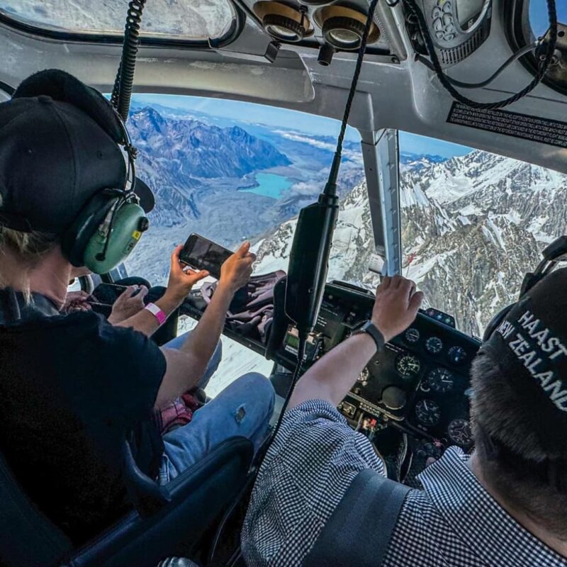 - Lot widokowy śmigłowcem nad Alpami Południowymi z widokiem na Mt. Cook i Hobbiton – wioska filmowa (Shire), nory, pub.